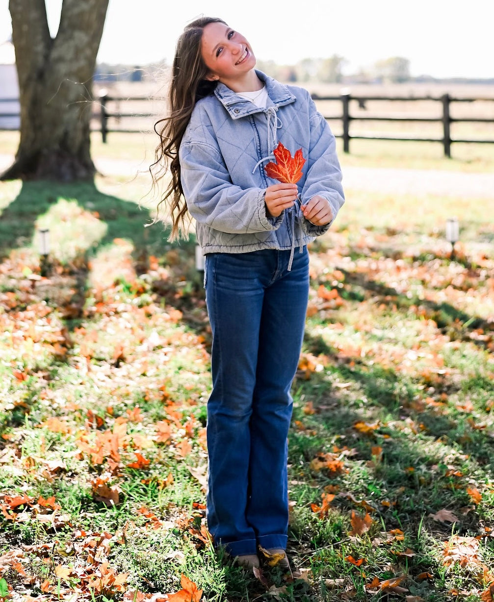 Denim Quilted Tie Puffer Jacket