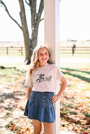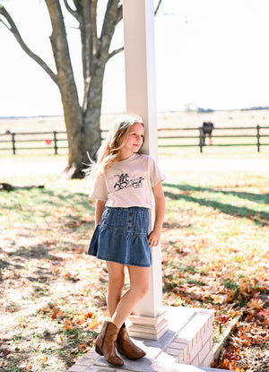 Girls Pleated Button Detail Denim Skirt *Washed Denim Fabric *Decorative Front Button *Elastic Waist